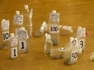 利用者さまの投げる目標は得点と職員の似顔絵の付いたビンです。