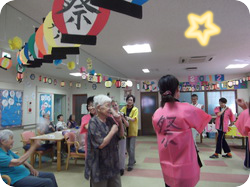 盆踊り。利用者さんも交えて楽しく「炭坑節」を踊りました。