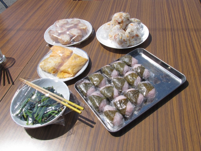 出来上がったら、テーブルや椅子を出して、外で食事会。さすがプロの和菓子職人さんの手作りは最高の出来栄えです。またお稲荷さんも味がしっかり染み込んでいます。