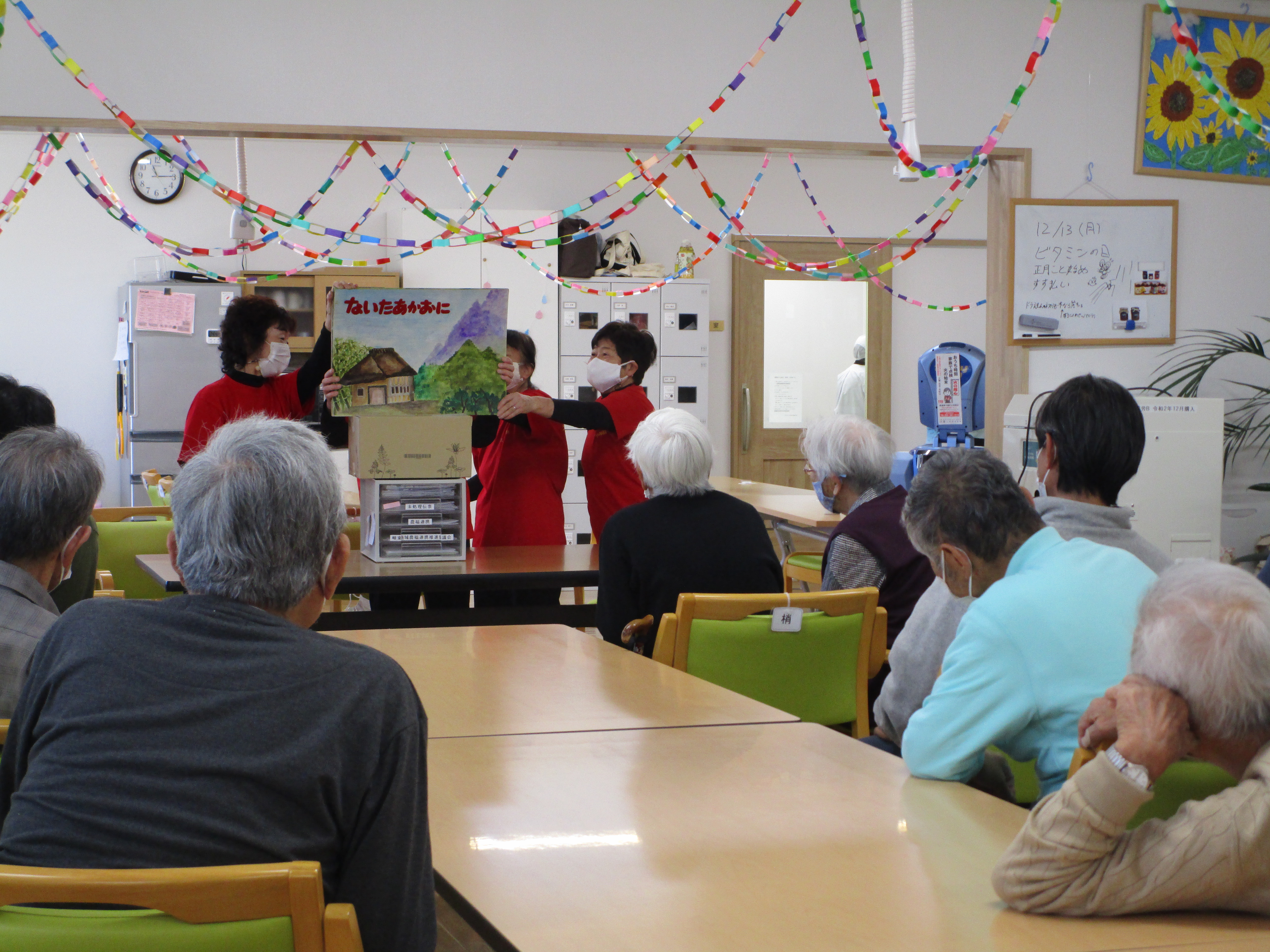 12月20日に石和デイサービスにて「クリスマス会」を開催しました。今年は、「月見草の会」の皆さんが、踊りと紙芝居を披露してくれました。