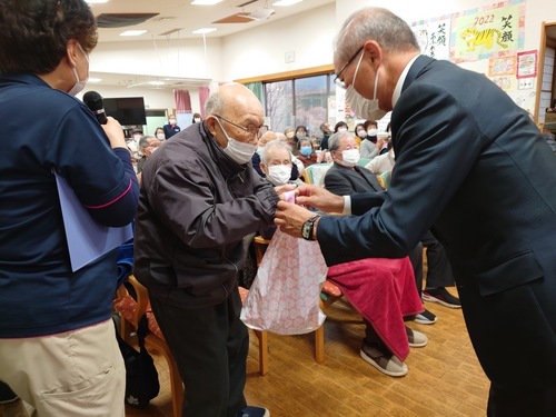 ご利用者様を代表して記念品を受け取っていただいたのは、1月に100歳の誕生日を迎えられた方です(カラオケで、いつも場をなごませてくださいます)