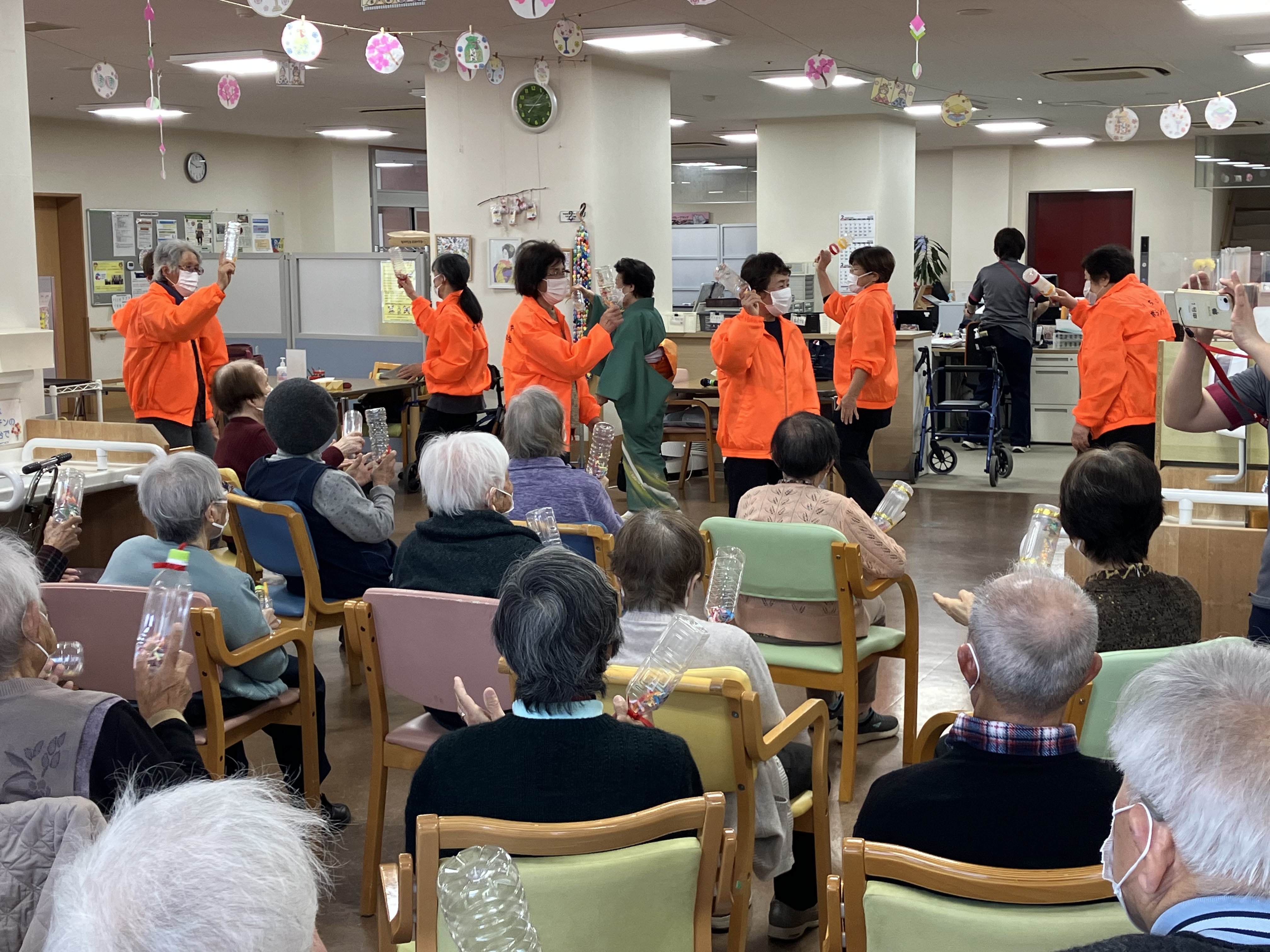 振ると音が鳴るように中に物を入れたペットボトルを利用者の皆さんに配り、曲に合わせて音を奏でます。利用者のみなさんも楽しそうにペットボトルを振っていました。