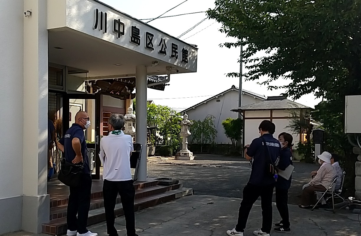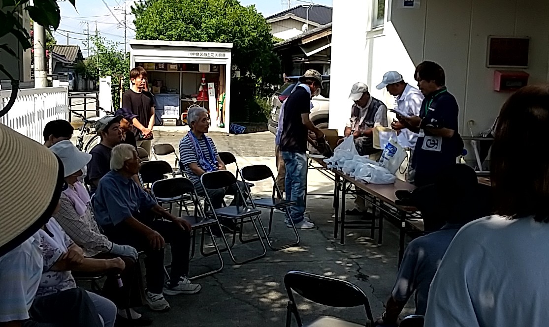 8月31日。笛吹市の一斉地区防災訓練が9時にスタート。住民さんは第一避難所である公民館に集合し、安全確認を行いました。