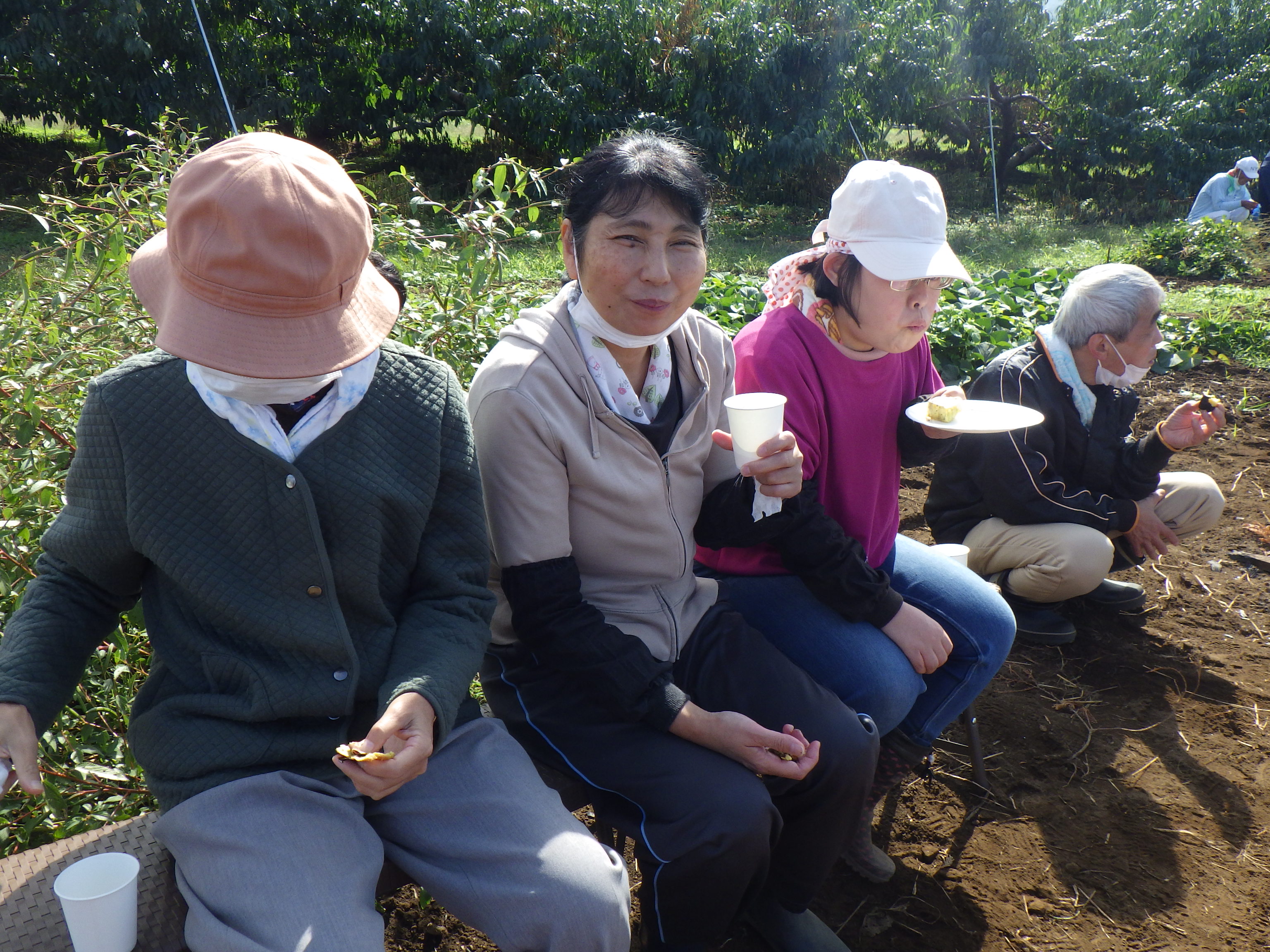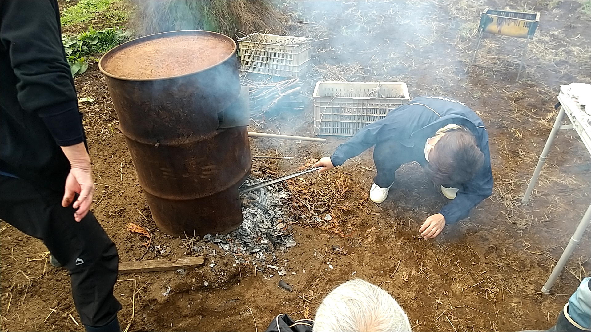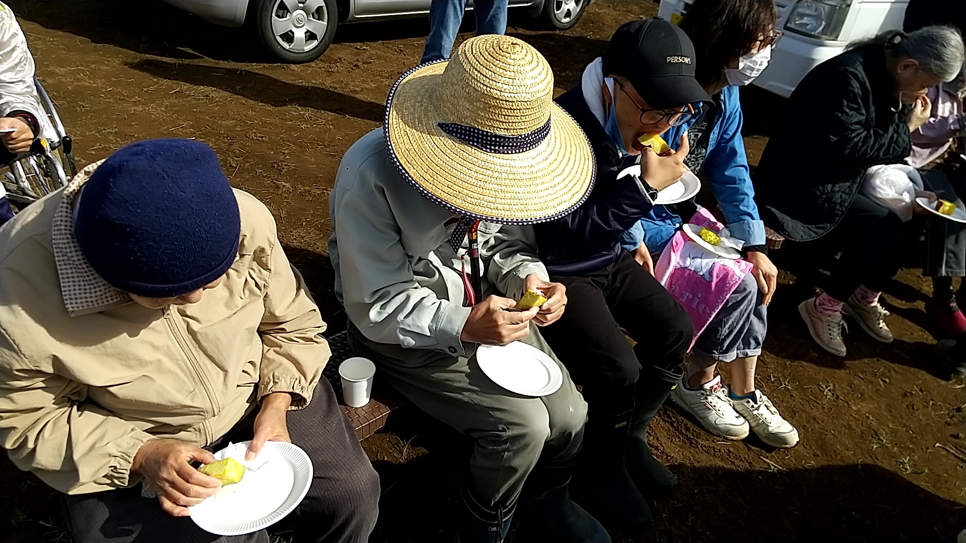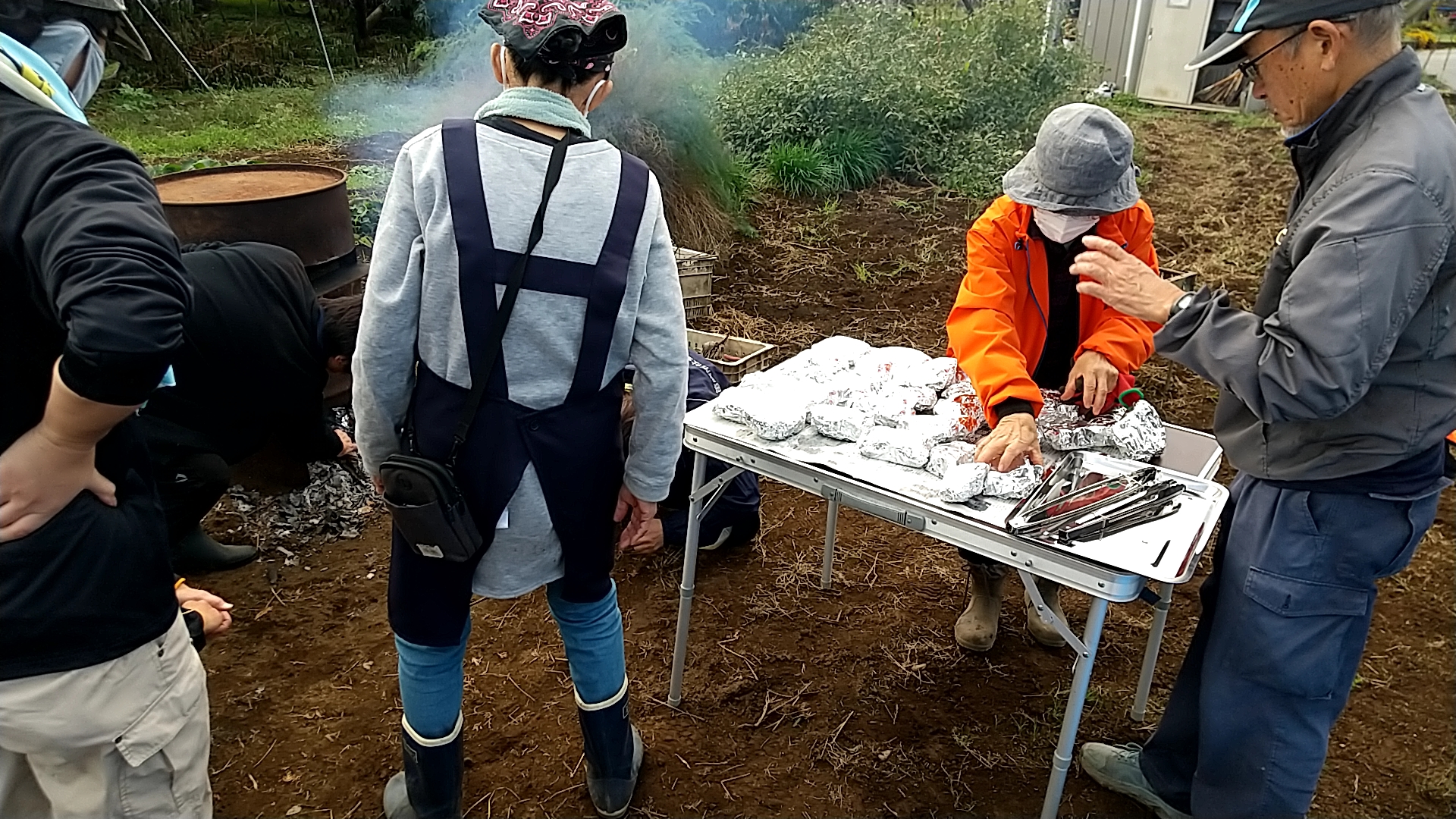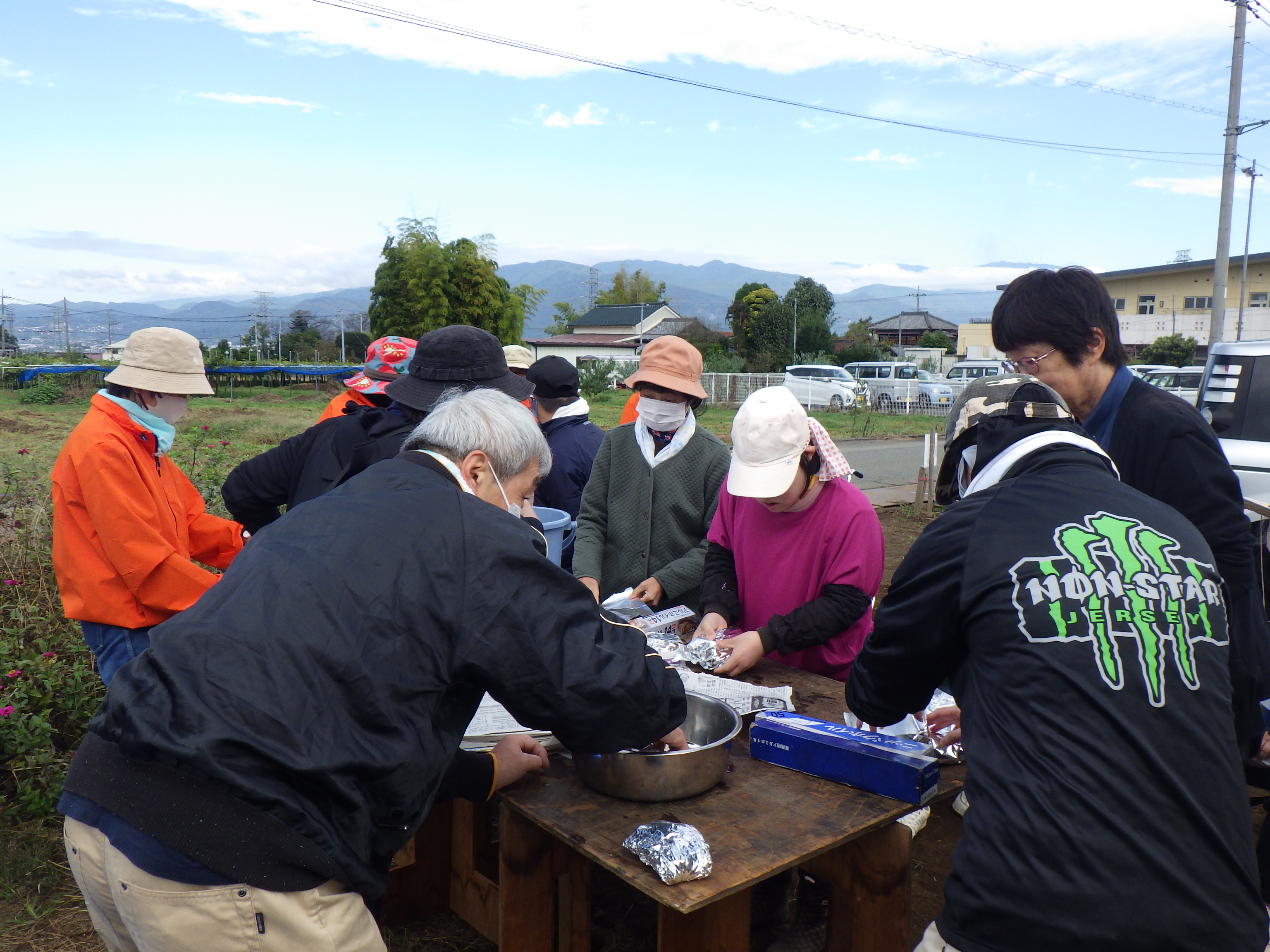 支援センターとふれあい工房のメンバーが畑に到着すると、すでにボランティアさんと民生委員さん、育美会のメンバーで焼き芋の準備を始めてくれています。