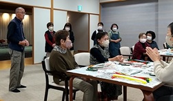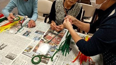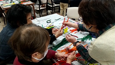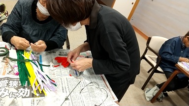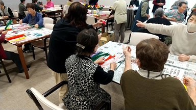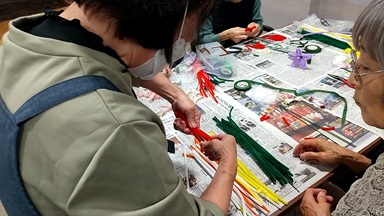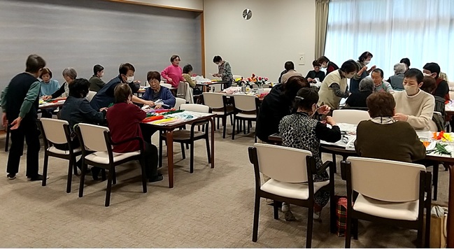 まずは10月22日に行われた、石和町シニアクラブ連合会女性部の皆さん。30名ほどがなごみの湯に集合。笛吹市シニアクラブ連合会の高齢者作品展に展示する作品を皆で作るということでした。
