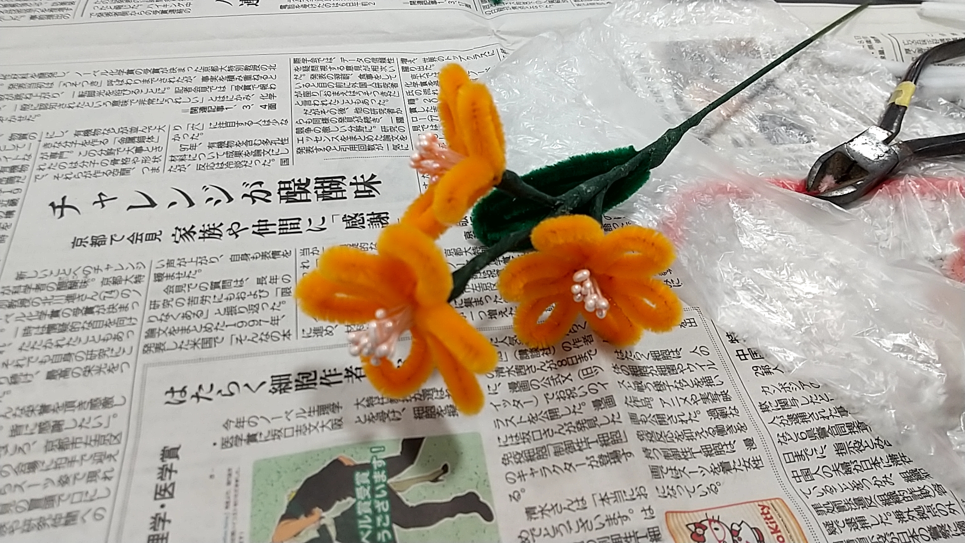 ジチョーもひとつやってみましたが、皆さんの方が上手だし早い。最後にはそれぞれの花の先をくるっと形付けていくのですが、作り手の拘りが見えるところです。