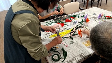 結局2時間以上も没頭しての連続作業。テーブルの上にはたくさんの花が咲いています。それも、作った方々の個性が表れた作品たち。この花を集めて、大きな作品に仕立てていくとのことです。