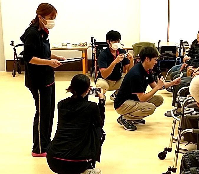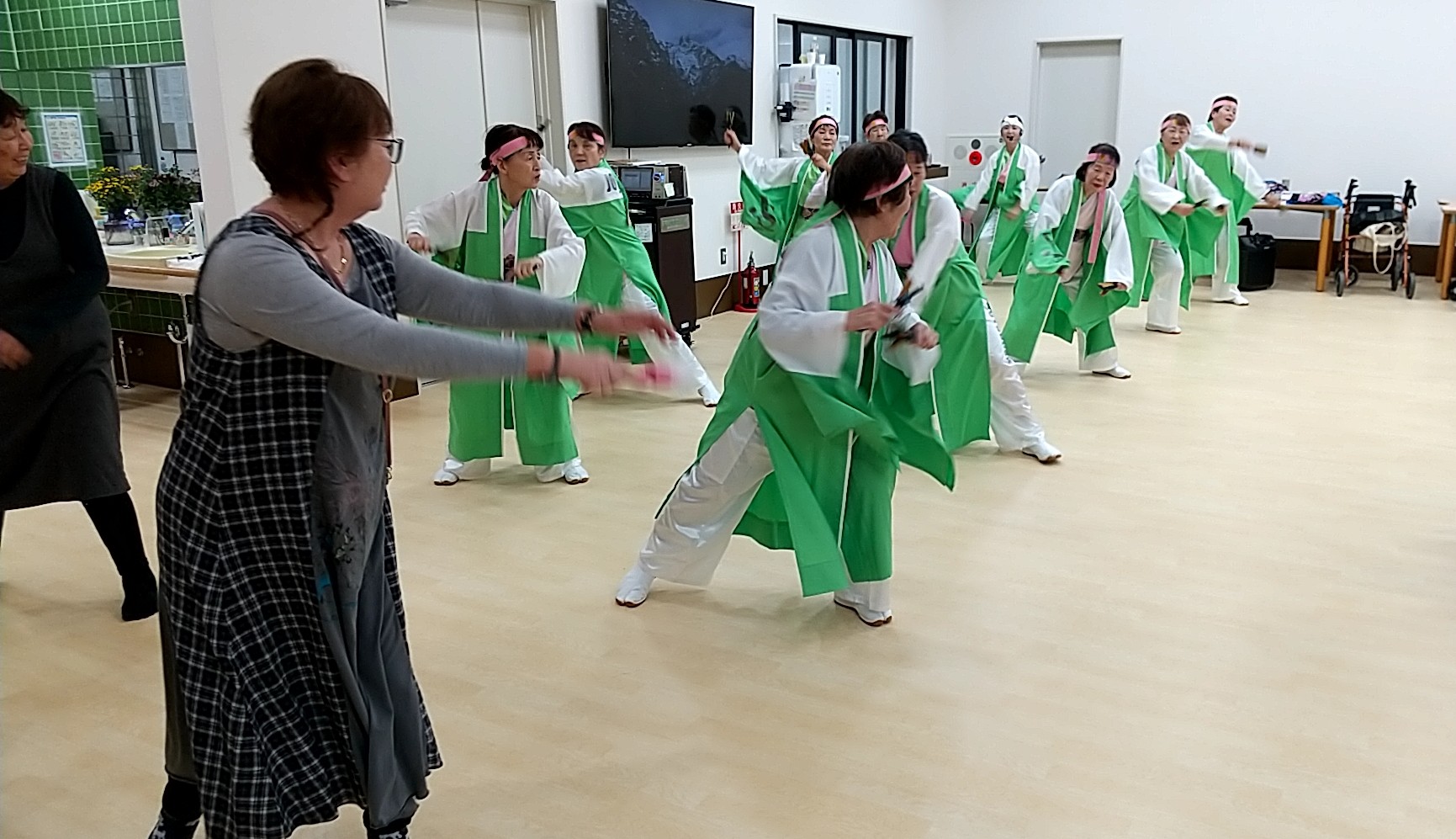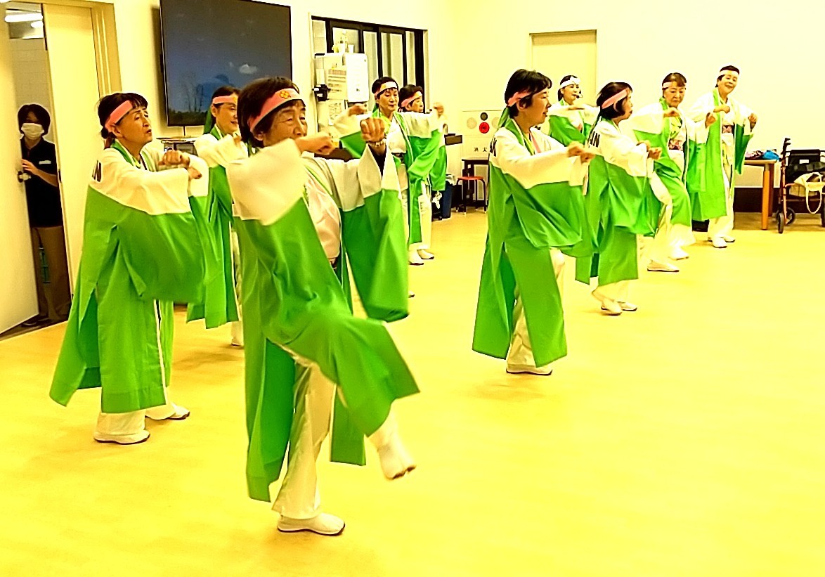 石和通所介護事業所は、改修工事を終え、明るく、とても奇麗なフロアとなっています。その一部を使っての踊りです。