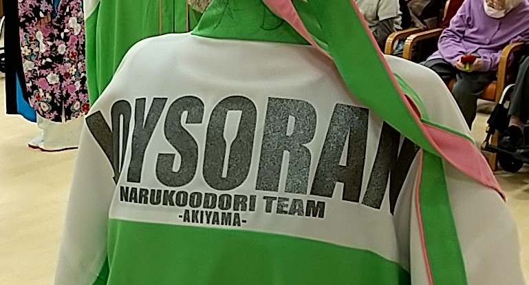 次は緑の衣装に着替えての踊りです。「よさこい なるこおどりチーム」と、オリジナルのプリントが入った衣装になります。