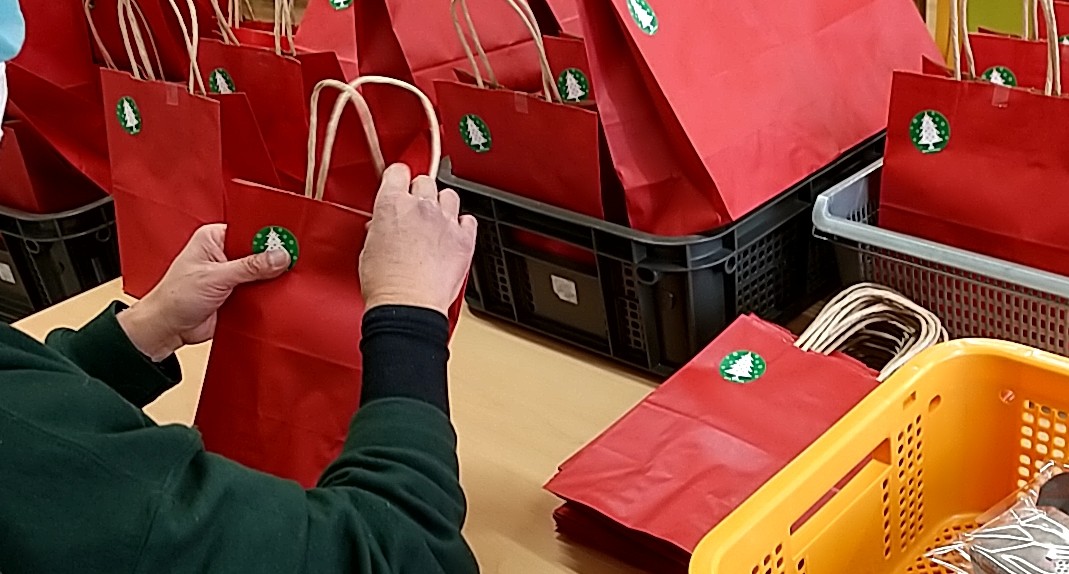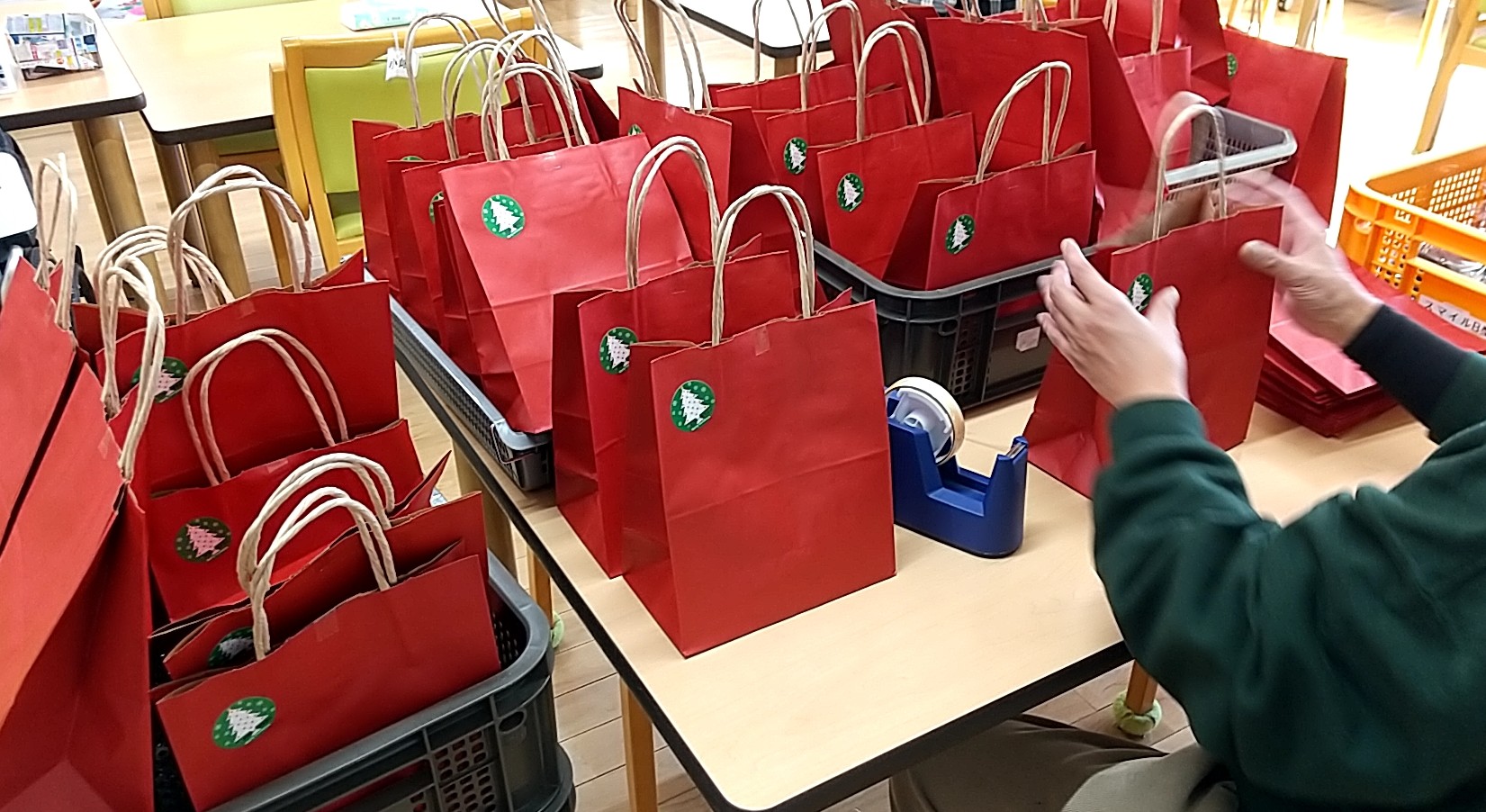 ひとつひとつ丁寧に赤い袋に入れて、サンタクロースに渡しています。