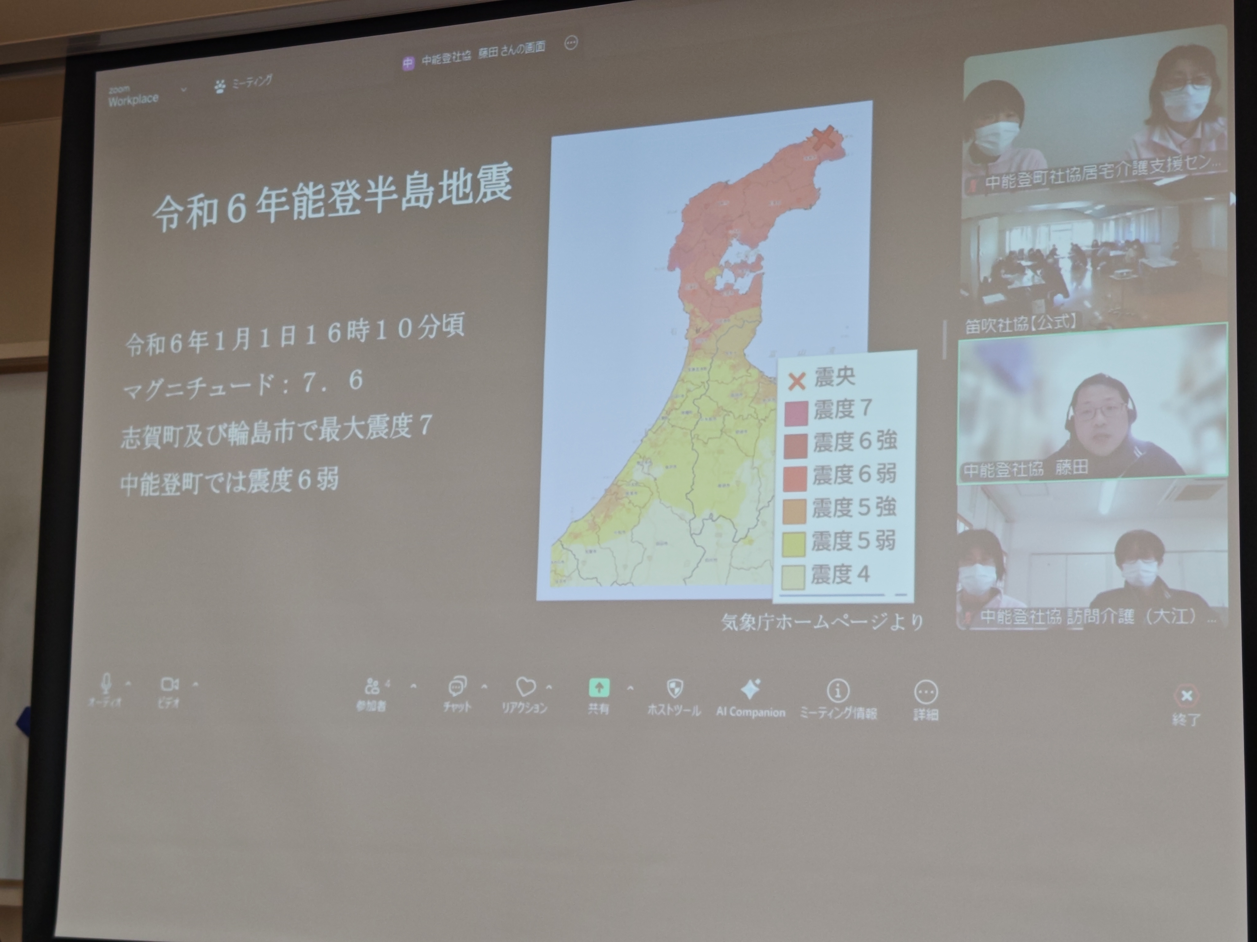 令和6年能登半島地震・中能登町災害ボランティアセンター運営に当会の地域福祉課職員が協力参加したことをきっかけに、中能登町社会福祉協議会とのつながりができ、体験談を伝えていただくこととなりました。
