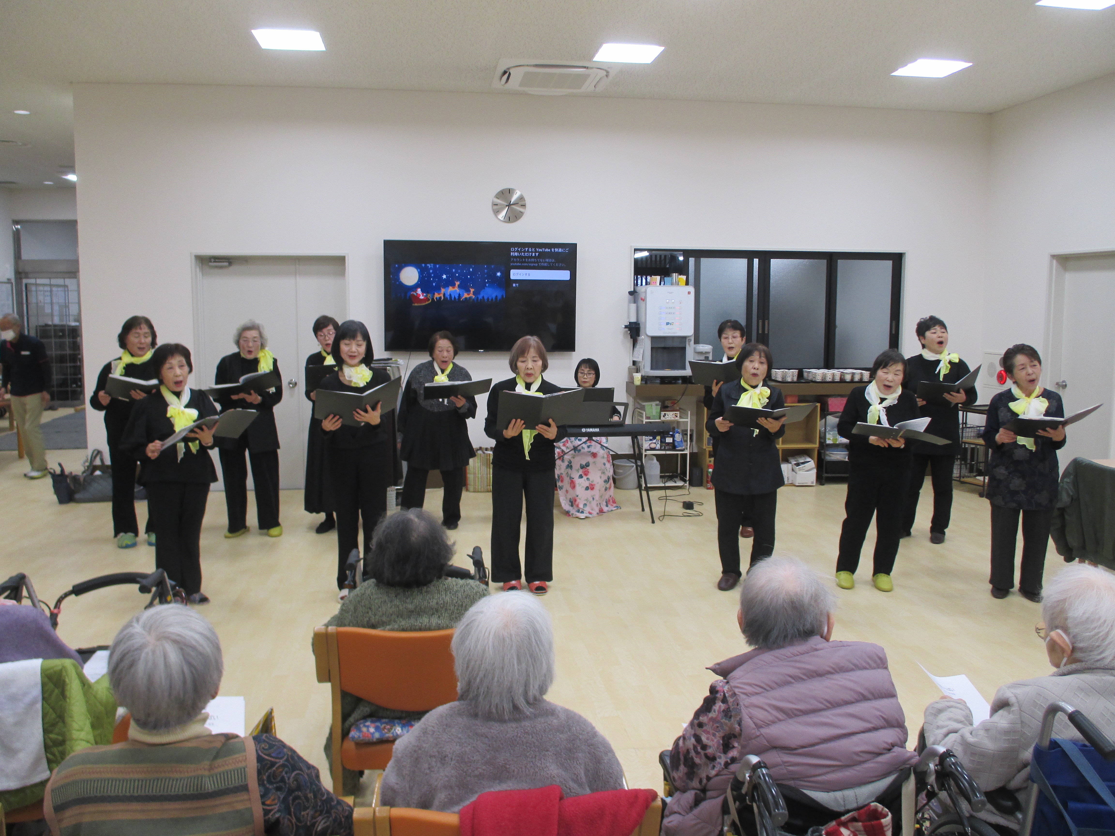 クリスマスソングや童謡、懐かしい歌が次々披露され、ご利用者様も一緒に口ずさんだり、手拍子をしたりと楽しい時間を過ごしていただくことができました。