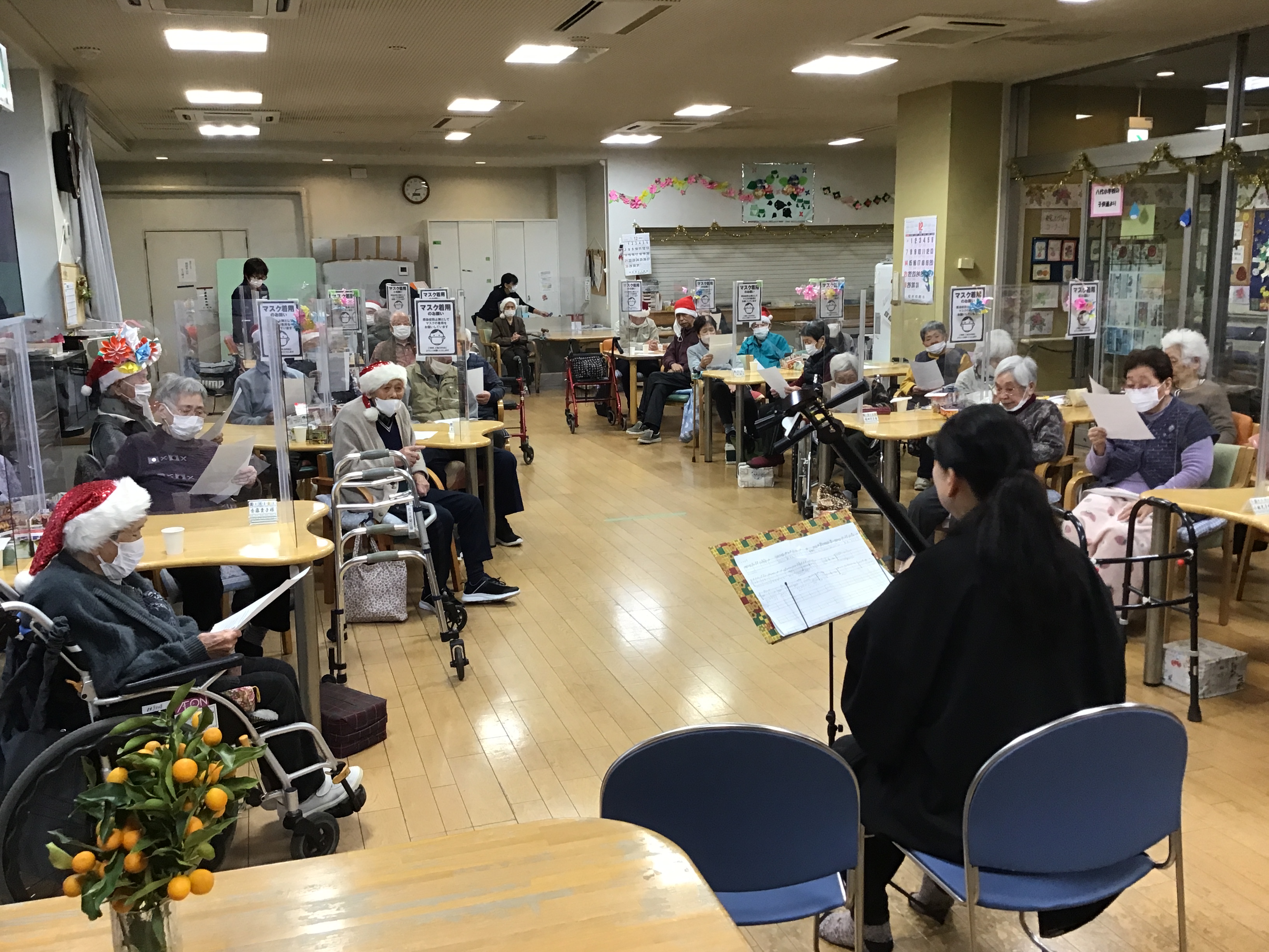 サンタクロースが登場するとご利用者様に喜びの表情が広がり、まるで子供に戻ったかのような笑顔があふれました。短い時間ではありましたが、普段とは違った催し(イベント)でご利用者様に喜んでいただき、とてもうれしく思いました