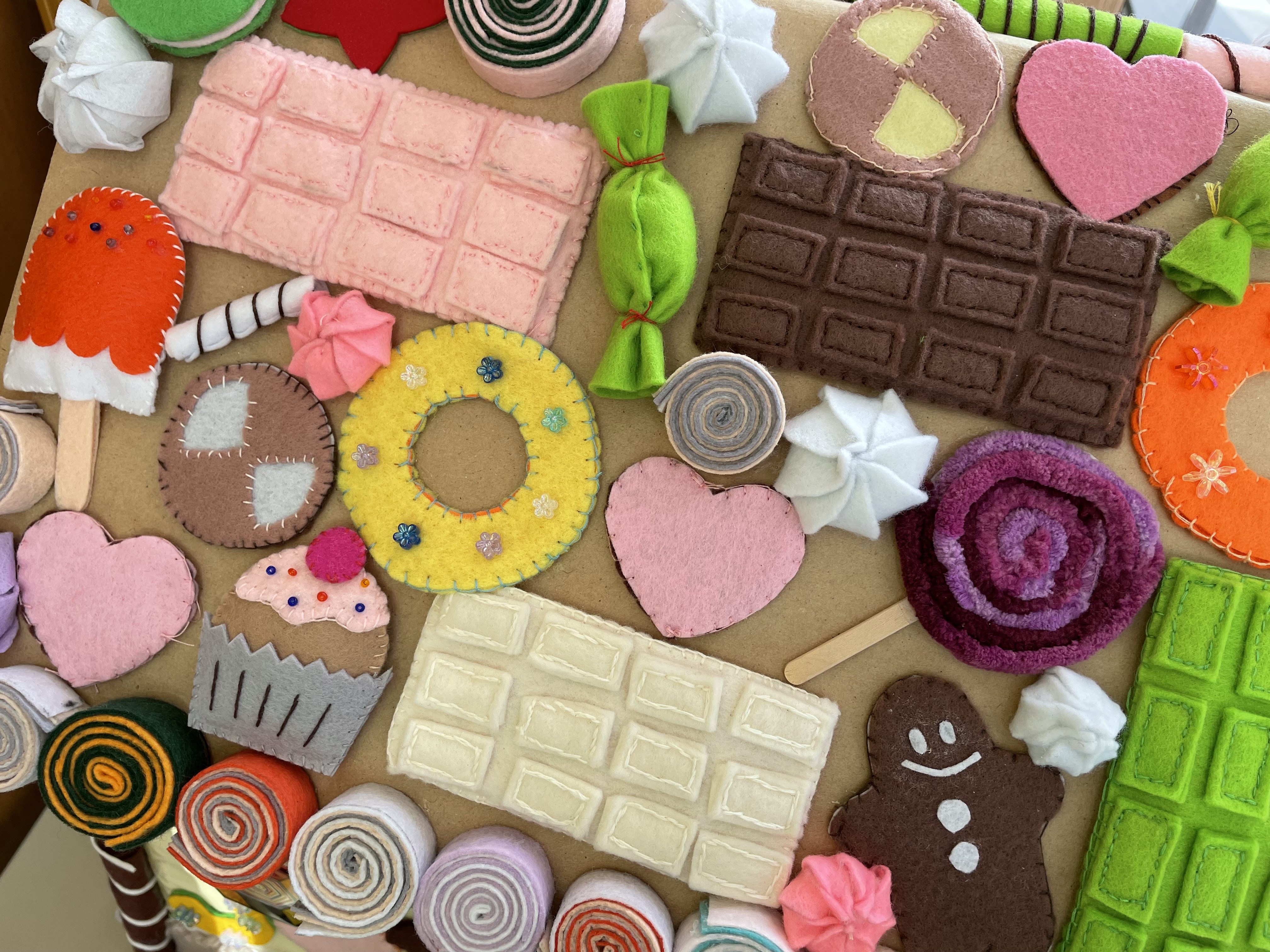 ▲フェルトで作った板チョコ。1枚6時間かけて縫いました。