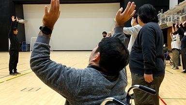 当日は、パラスポーツセンターの職員の方が講師をして下さり、軽い準備運動から始め、音楽に合わせた全身運動でからだをほぐしました。