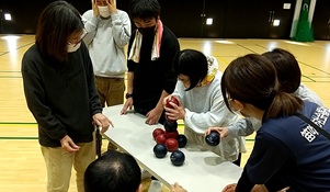 普段は交流の少ない3型の利用者さんと混合チームを作り、まずはボッチャのボールに慣れるところから取り組みました。