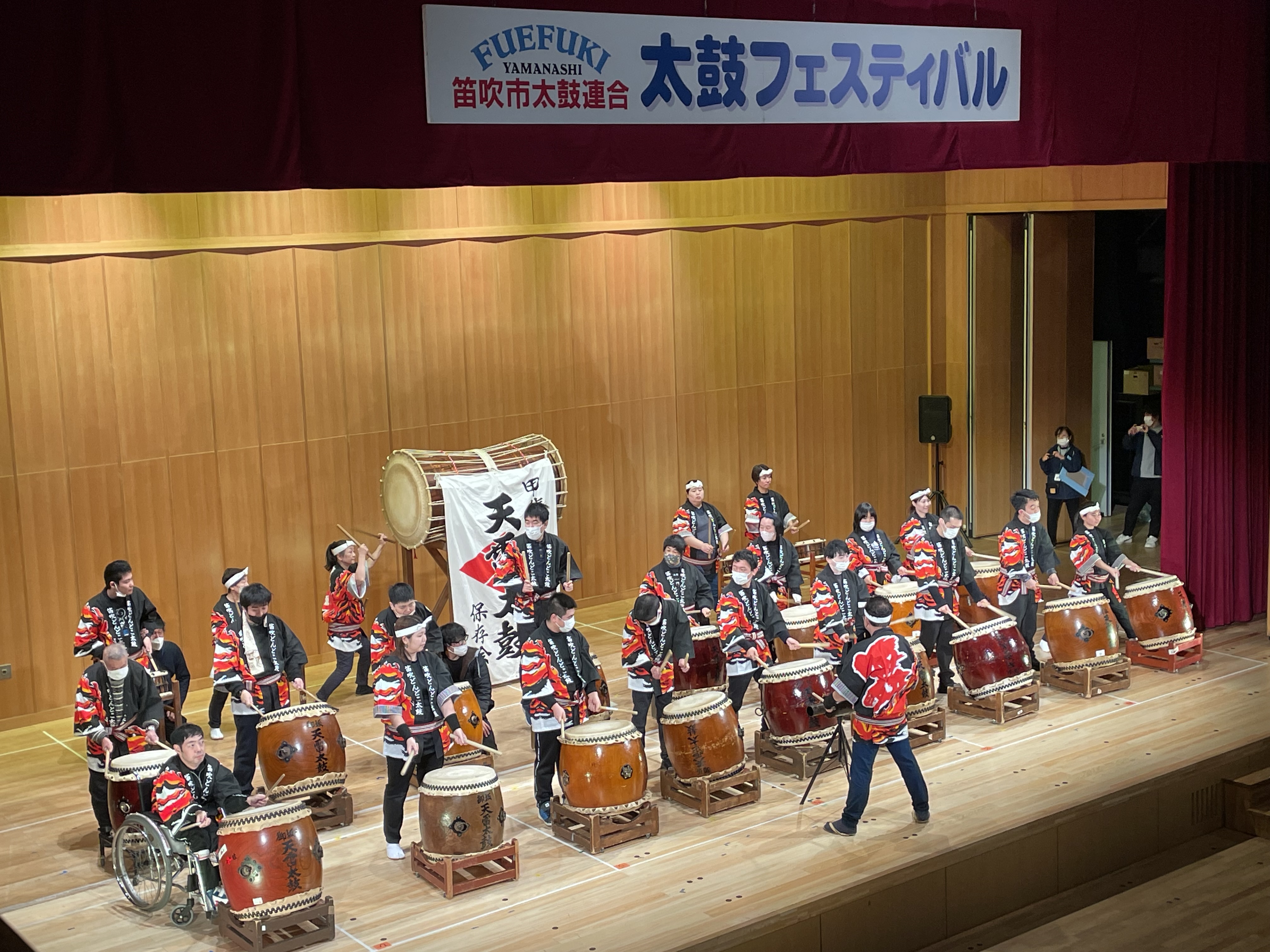 令和8年1月24日(土)、笛吹市いちのみや桃の里ふれあい文化館で、笛吹市太鼓連合会主催の太鼓フェスティバルが開催され、『笛吹どんどこ太鼓』もこの大イベントの大きな会場で力いっぱい演奏してきました!!