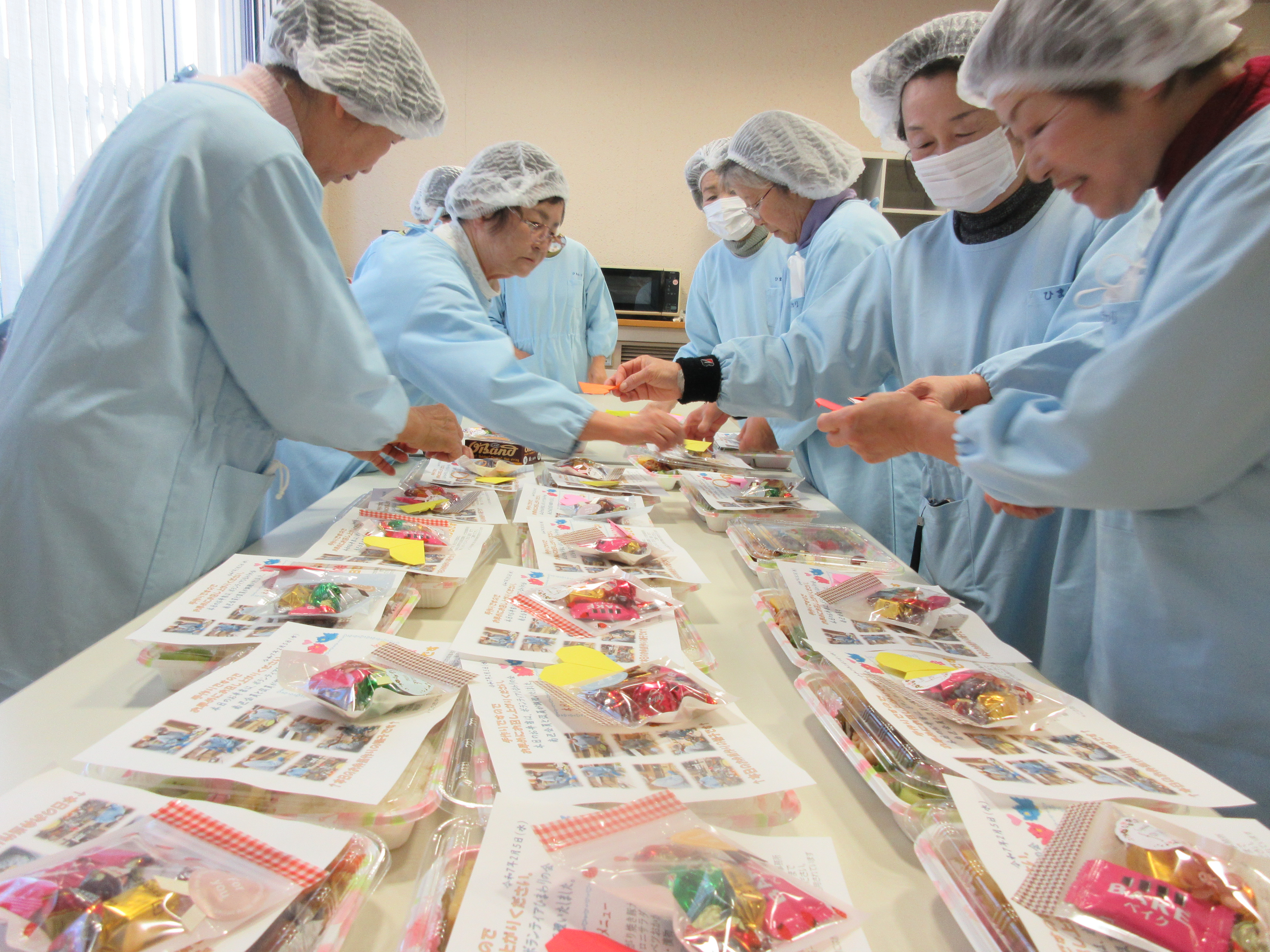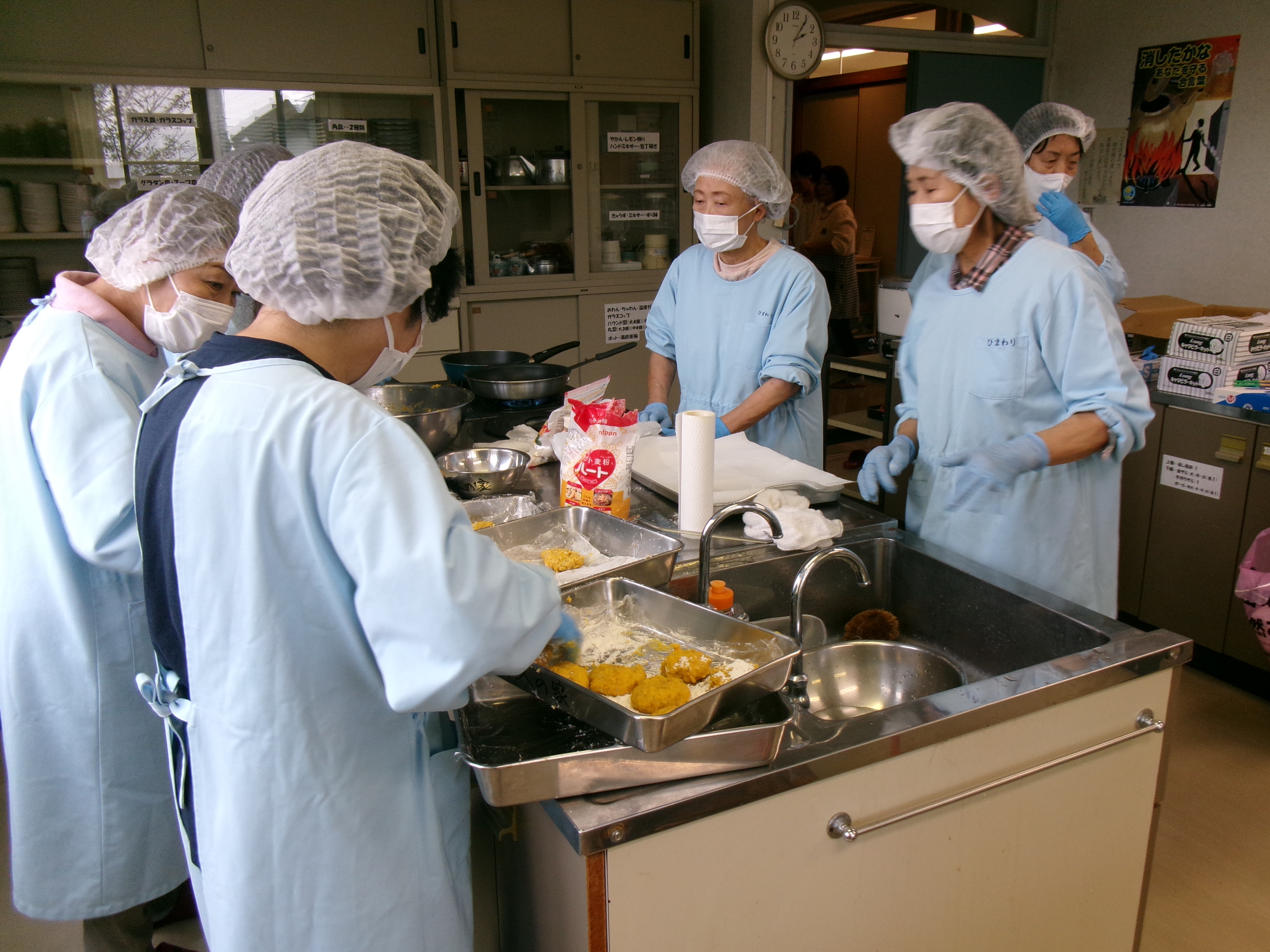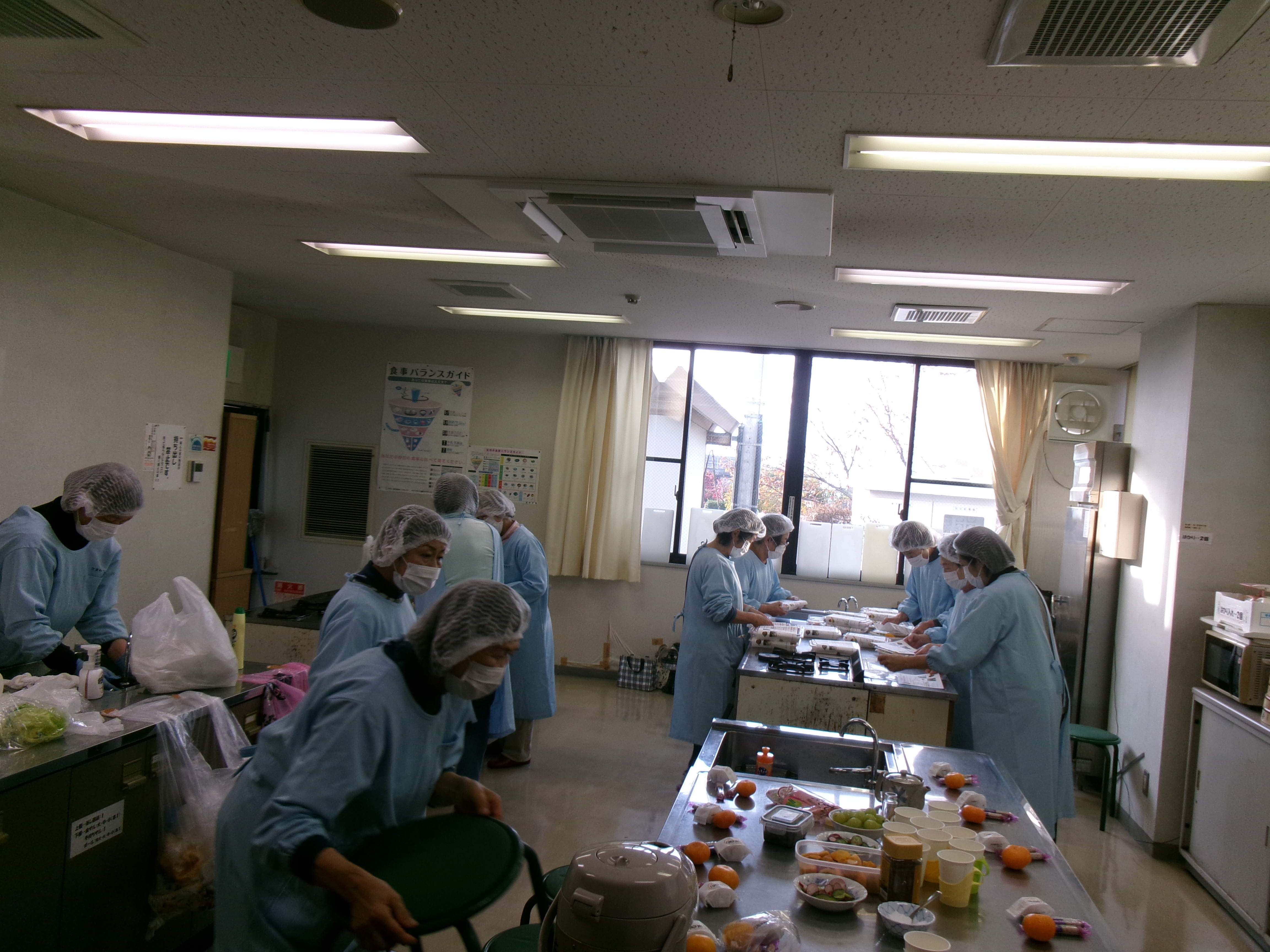 お弁当づくり当日。皆さんお揃いの水色の調理服を着て調理場で和気あいあいと準備しています。