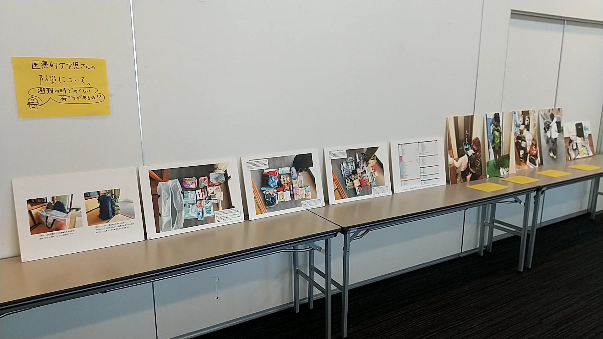 この日もなーさんは活動服(特別なキャラクター)で登壇。とにかく明るいなーさんの軽快なトークで、サークルでの活動を紹介していただきました。その中でも、災害時の避難は共通の課題。酸素や吸引が必要な障がい児者や高齢者への対応、それら機械を作動させるための電源の確保や介護のための空間など、当事者家族にとっては避けられない課題があります。活動の様子を展示していましたが、そのリアルな姿を通じて、電気が使えない状況だったらどうなるのだろうか、避難場所に安全に避難できたとしても、それが安心の環境であるとは言い難いだろうなということを考えました。