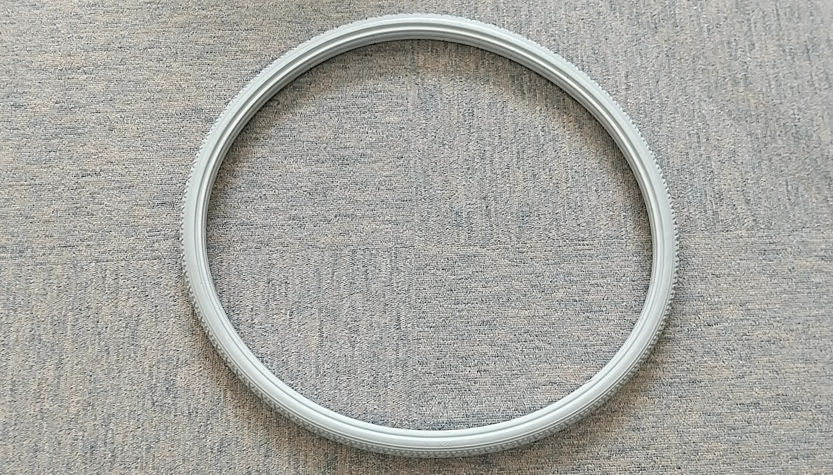 ノーパンクタイヤは、チューブは私用せず、タイヤ全部がゴムになっています。普通のタイヤに比べ、若干重く、クッション性が低下します。